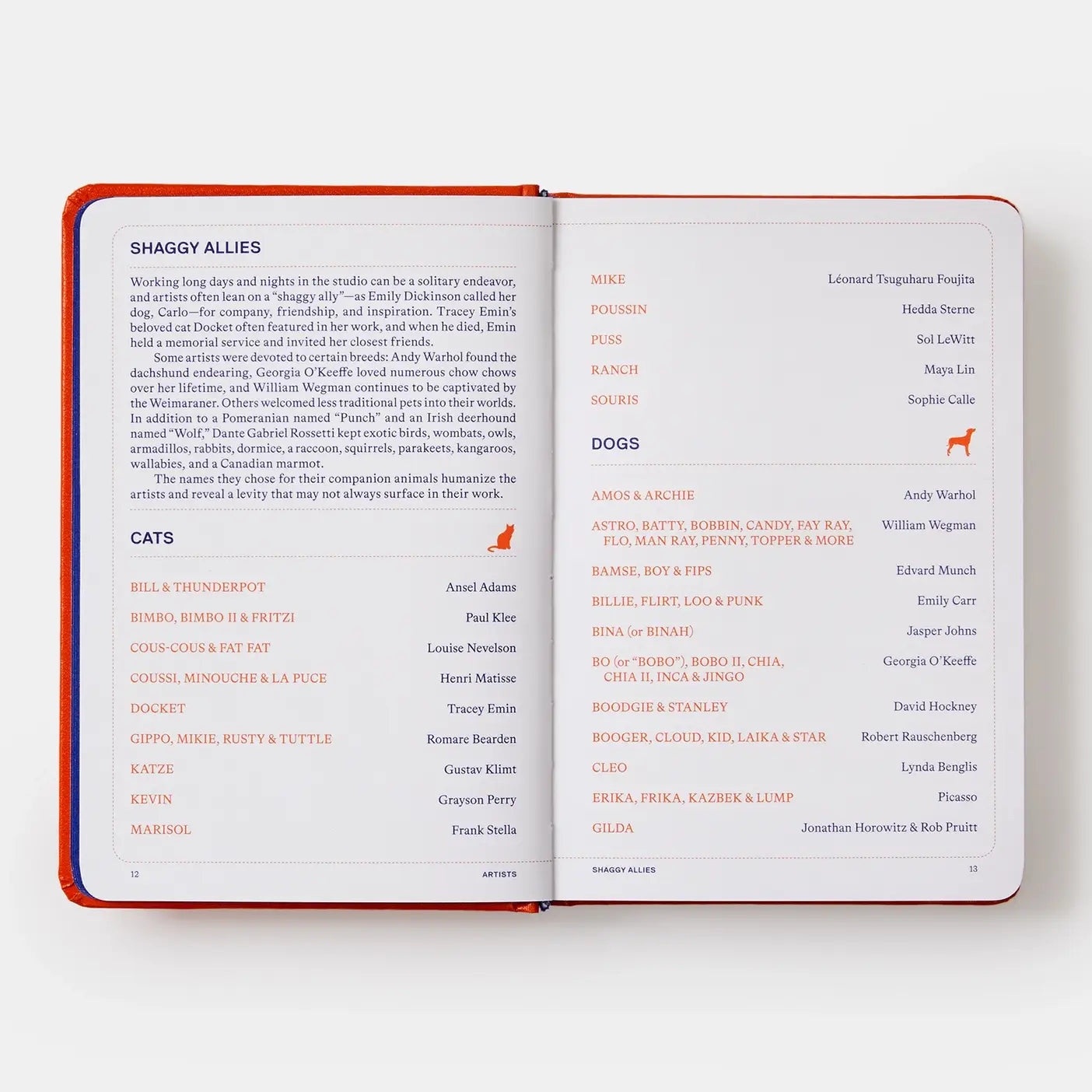- names of artists' pets: Fat Fat & Cous-Cous (Louise Nevelson's cats), Giotto and Goya (John Baldessari's dogs)