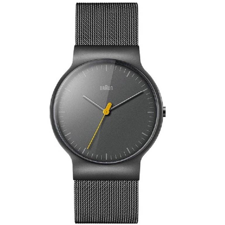 Braun mens multi-award winning slim 3-hand analogue watch. 38mm matt titanium plated stainless steel case with quartz movement and iconic yellow second hand. Scratch resistant mineral glass and bespoke screw on case back. 3ATM water resistance. Steel milanese mesh strap.
