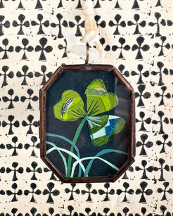 1.5" x 2" highest quality giclée print on 100% cotton paper - framed in petite antiqued glass locket frame. Brandie Stonge’s original collage work begins with her hand painted cotton papers, antique ephemera, and mixed media - beautifully layered to create a one of a kind approach to her imagery. These reproduction prints are created in high detail to retain the cut paper shadows and character in her work. objet d'art on ribbon for hanging - not intended for daily wear. signature on reverse.