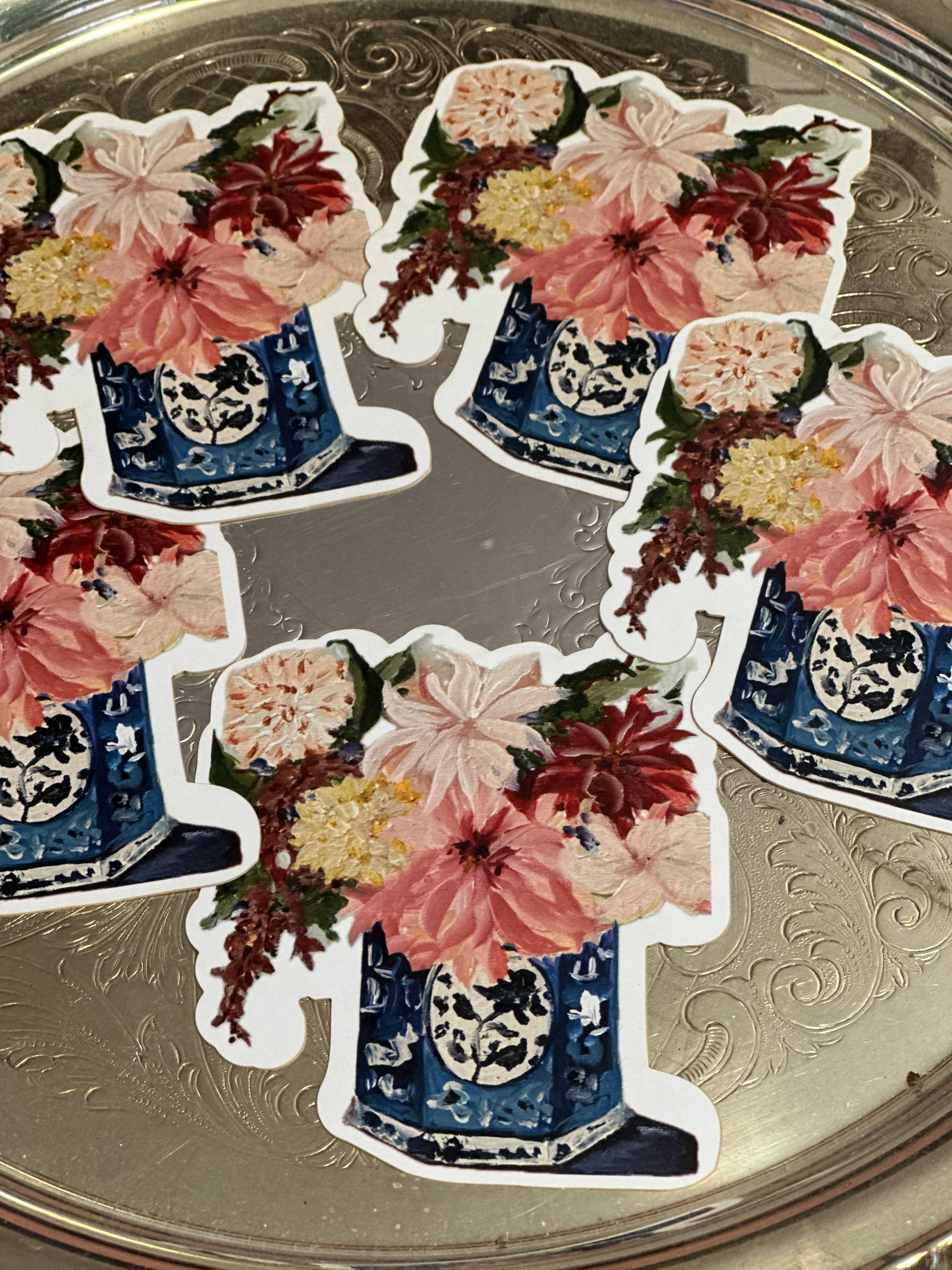 This lovely bouquet in blue and white vessel die cut card is from an original Mindy Carpenter painting. It's printed on heavy quality card stock, packaged in cello bag and with accompanying description card tucked in the bag. Use as a charming greeting card or fun table place setting.