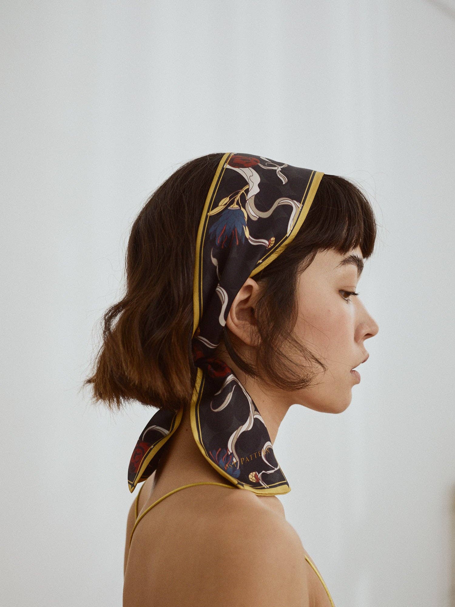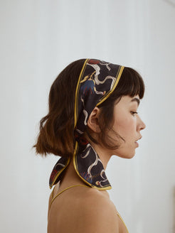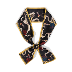 This silk twilly neck bow scarf grasps us to the ethereal and mysterious nature of the fictional world we dive into when we read a book and transports us to a different dimension. These patterns and shapes define the mystical and magical feel of a different era.