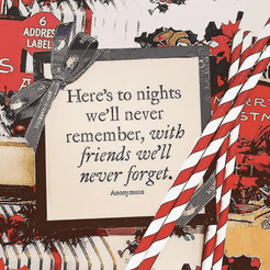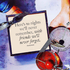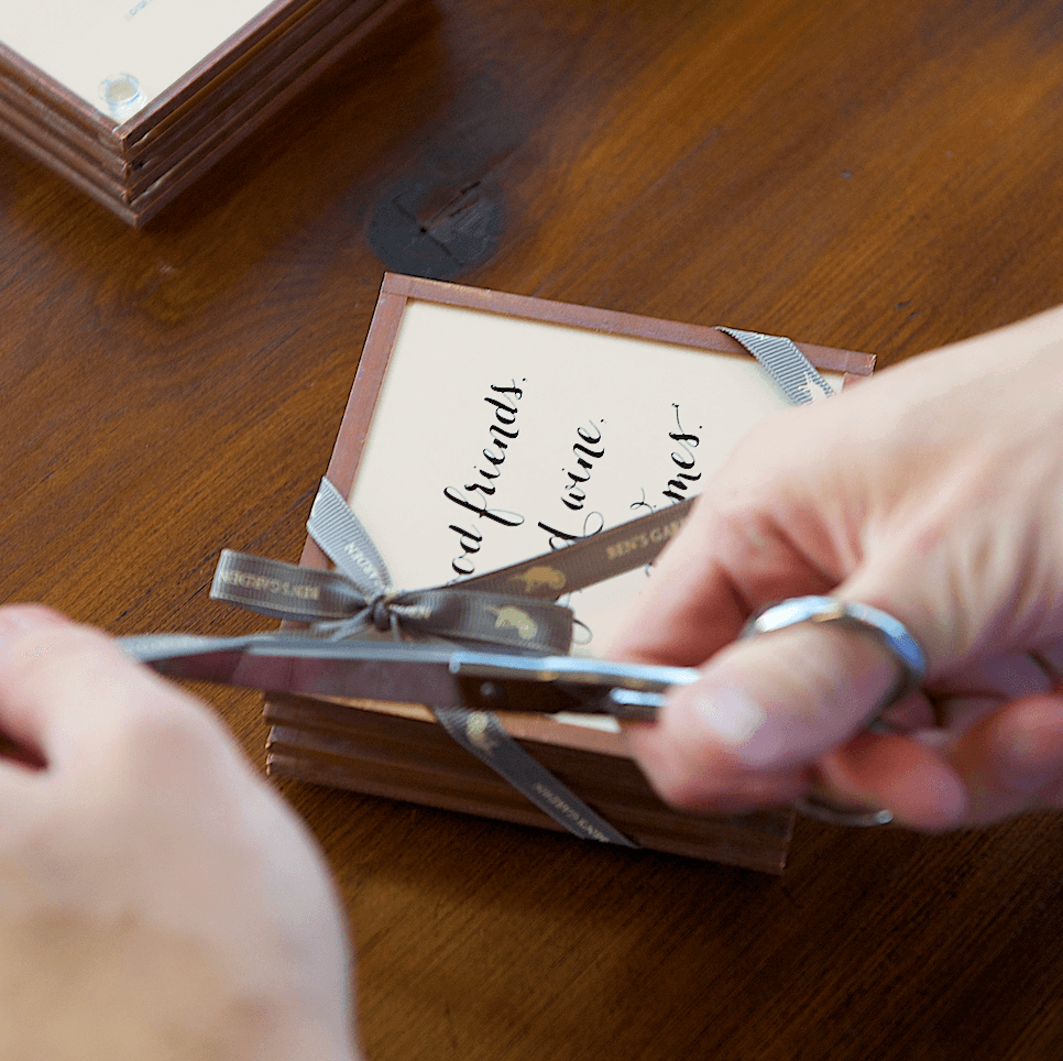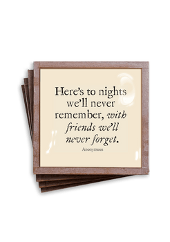 Handcrafted of glass and antiqued copper with plastic bumpers to protect the tabletop, effortlessly entertain your guests with charm. Classic typeset is composed on natural background and the set of 4 is wrapped with pewter grosgrain ribbon.