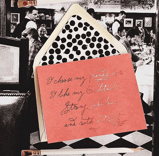 Greeting card features a design that includes shimmering gold foil and a red coral envelope with black and white polka dot envelope lining.