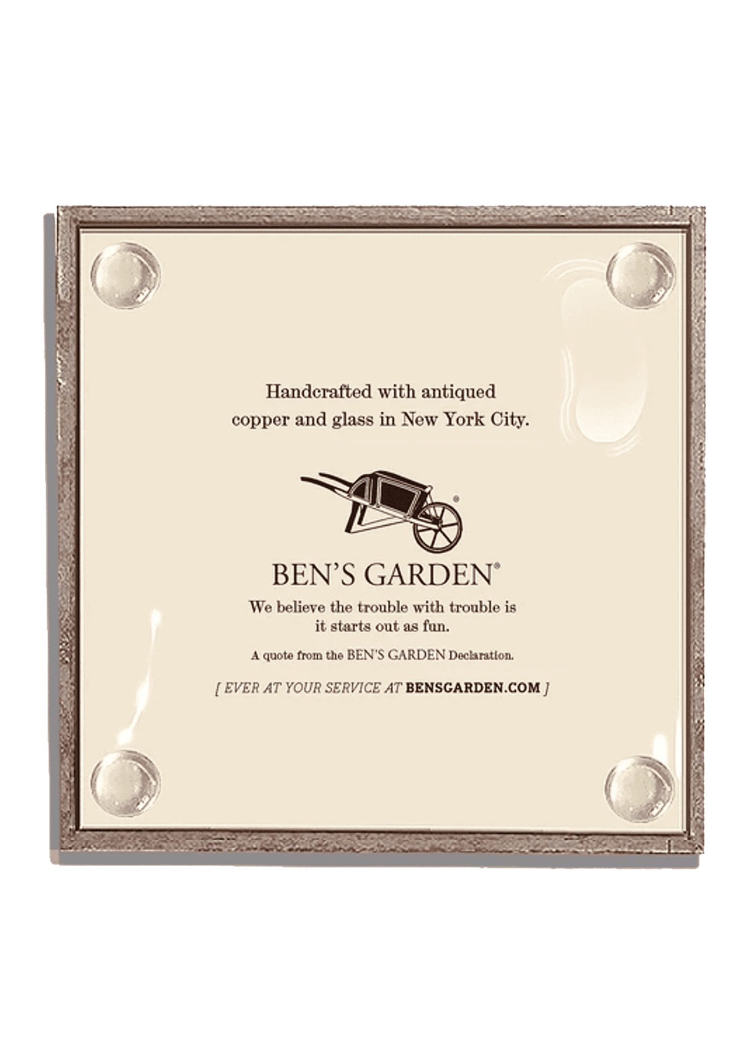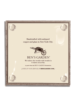 Each coaster is handcrafted in New York, glass and copper joined with a steady hand, bumpers tucked discreetly beneath so the only rings in sight are on fingers. The quartet arrives tied with pewter grosgrain ribbon, nestled in our signature Ben’s Garden gift box, and finished on the back with a maker’s mark that tells the whole story. Pour freely, laugh loudly, feelings optional.