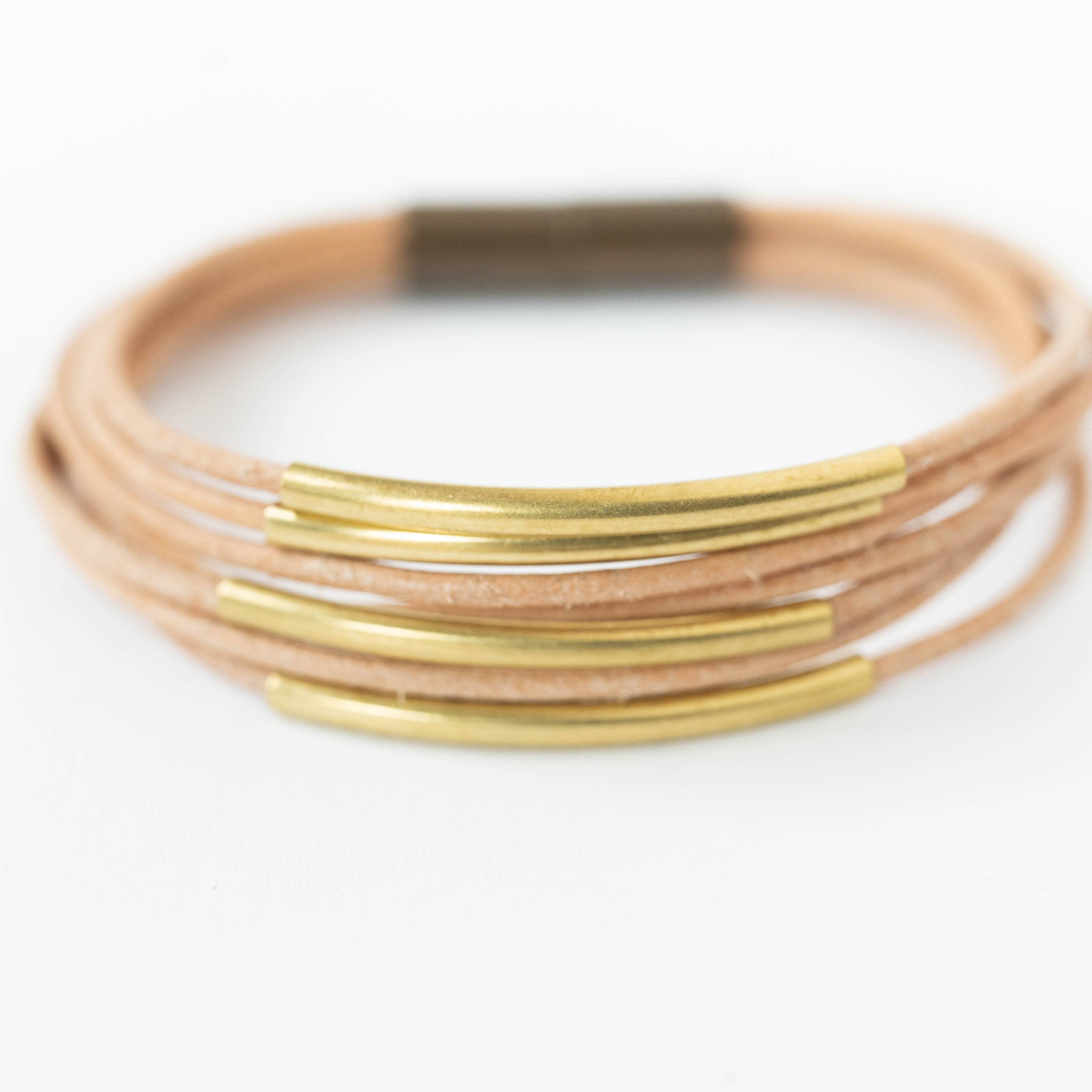 Four leather cords have a fitted thin 1.5" golden brass tube.
