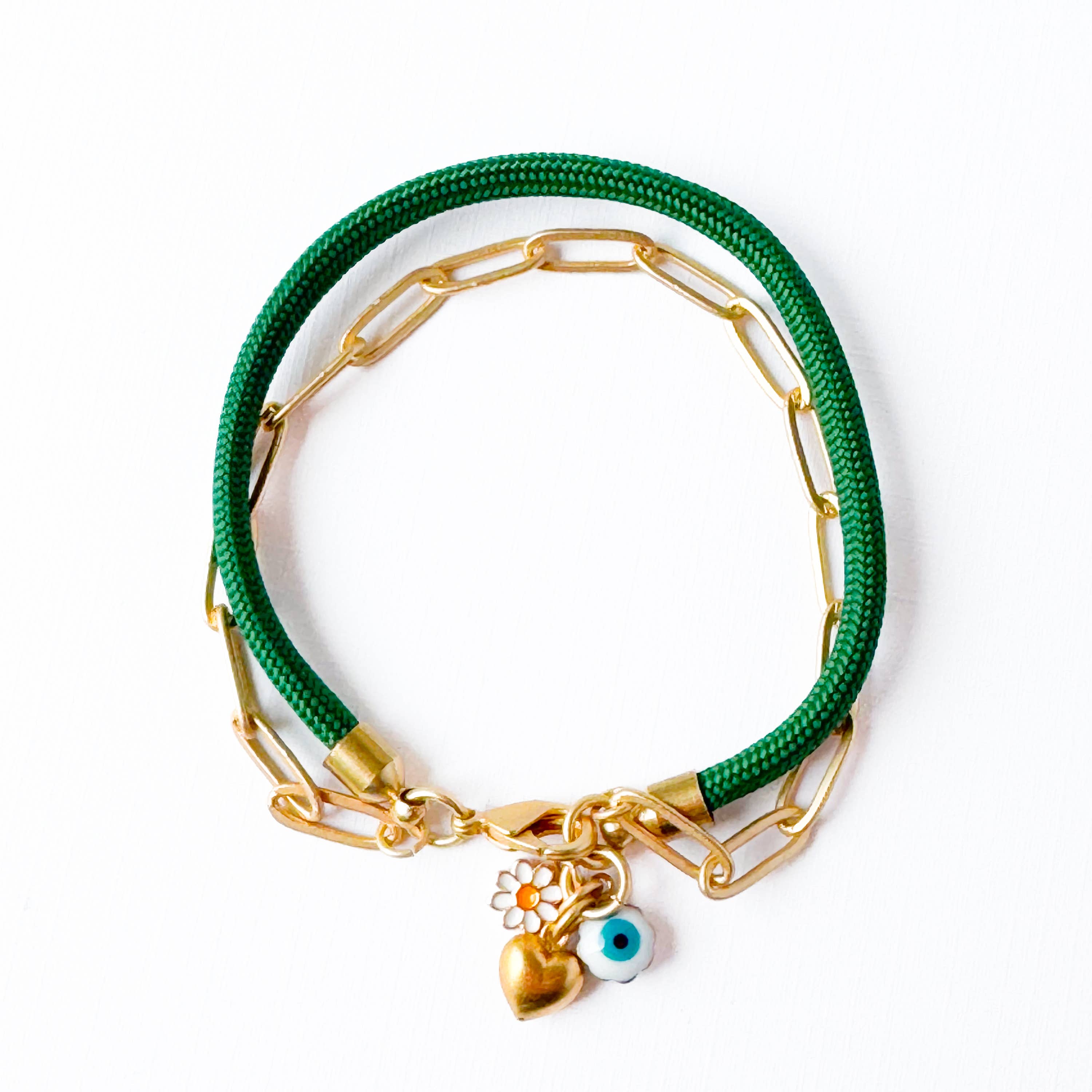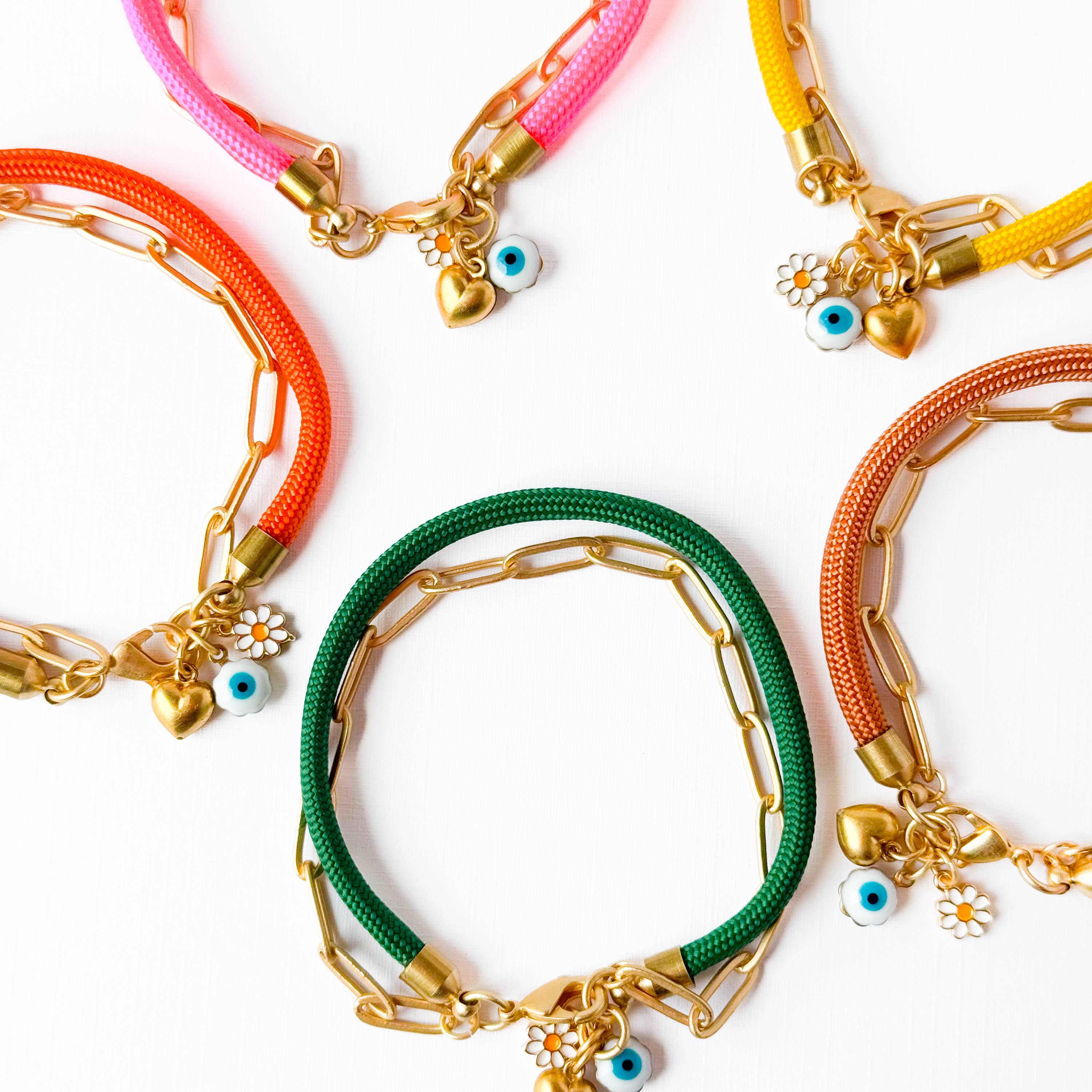 Featuring a protective evil eye charm, a cheerful daisy, and a delicate heart.