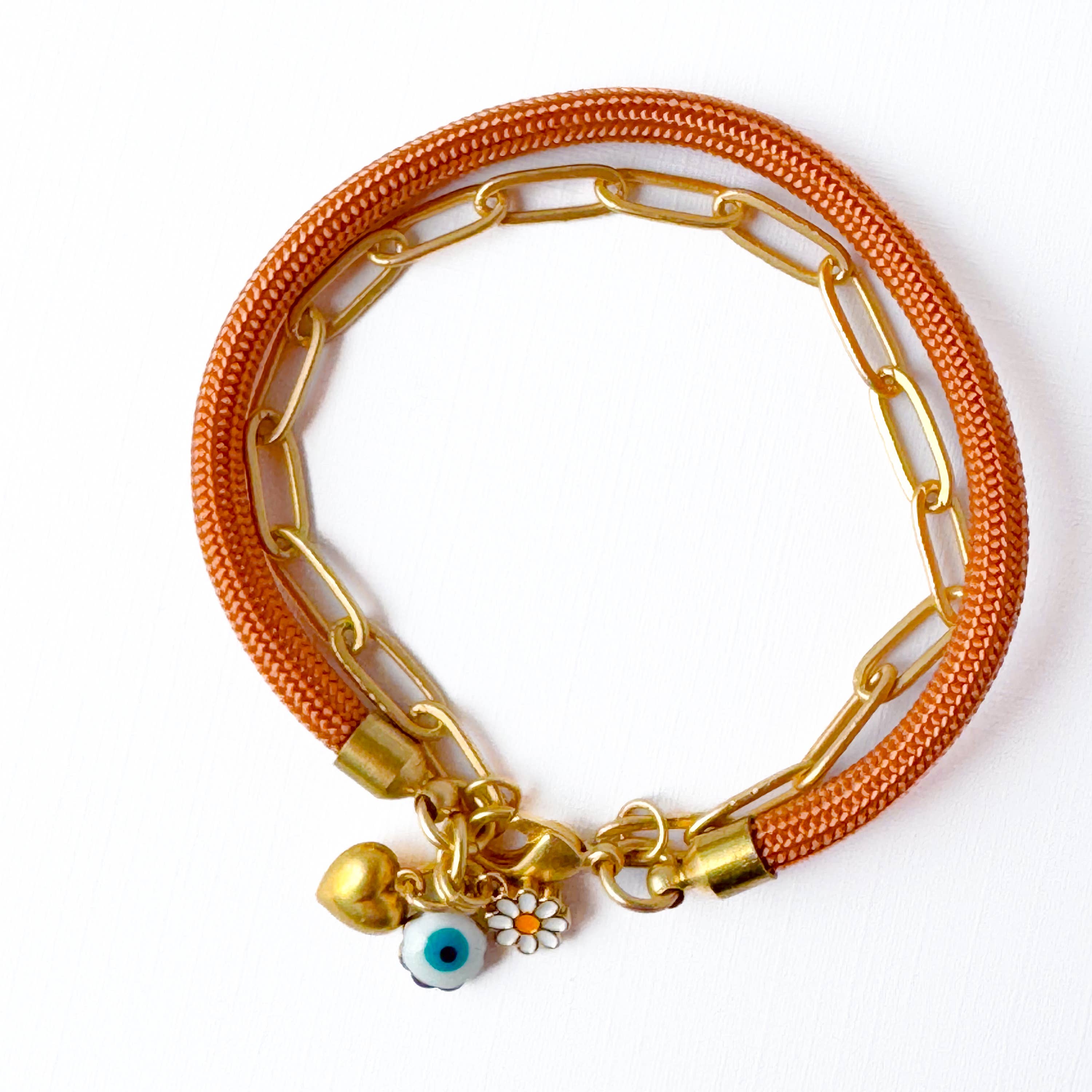 charms are a tiny daisy, a small puffy brass heart, and an evil eye charm.
