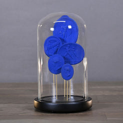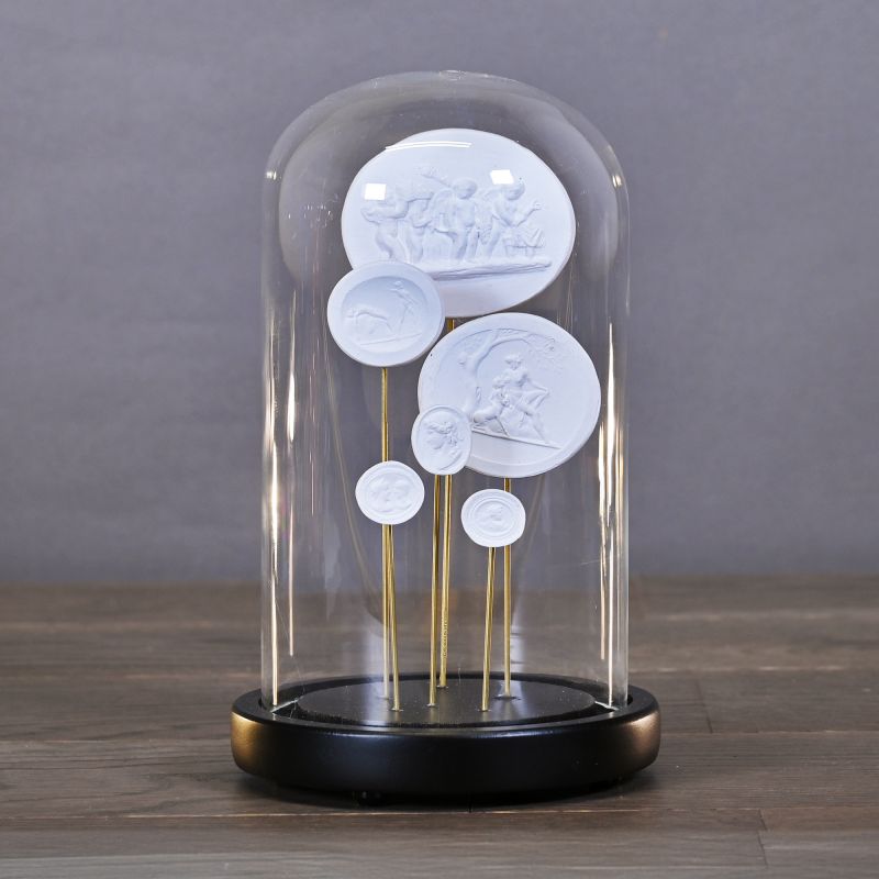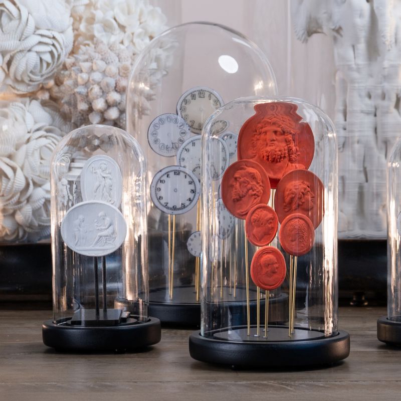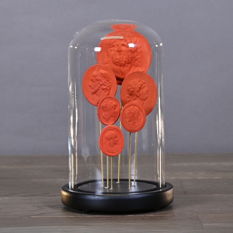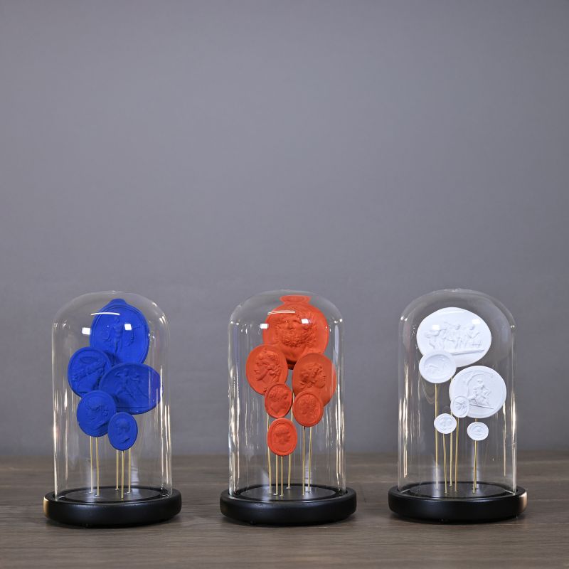 Globes featuring a collection of coloured plaster intaglios. Each globe is distinguished by the unique colour of its intaglios: azure blue, white and coral. In the 17th century, many young aristocrats and artists undertook the ‘Grand Tour’, a voyage of initiation throughout Europe inspired by the Greek and Latin humanists, which enabled them to enrich their cultural knowledge and further their education. Greece and Italy were their favourite destinations. On their return or during their travels, they carved intaglios in the antique style, like the ones shown here.