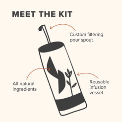 DIY infusion kits include a 16 oz glass jar, custom filtering pour spout, pre-measured ingredients and an instructional booklet with our favorite cocktail recipes.