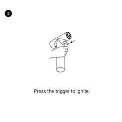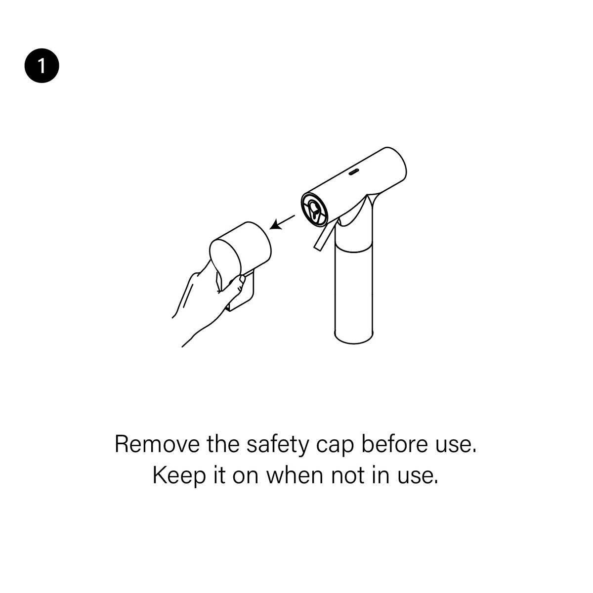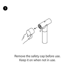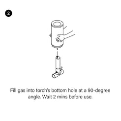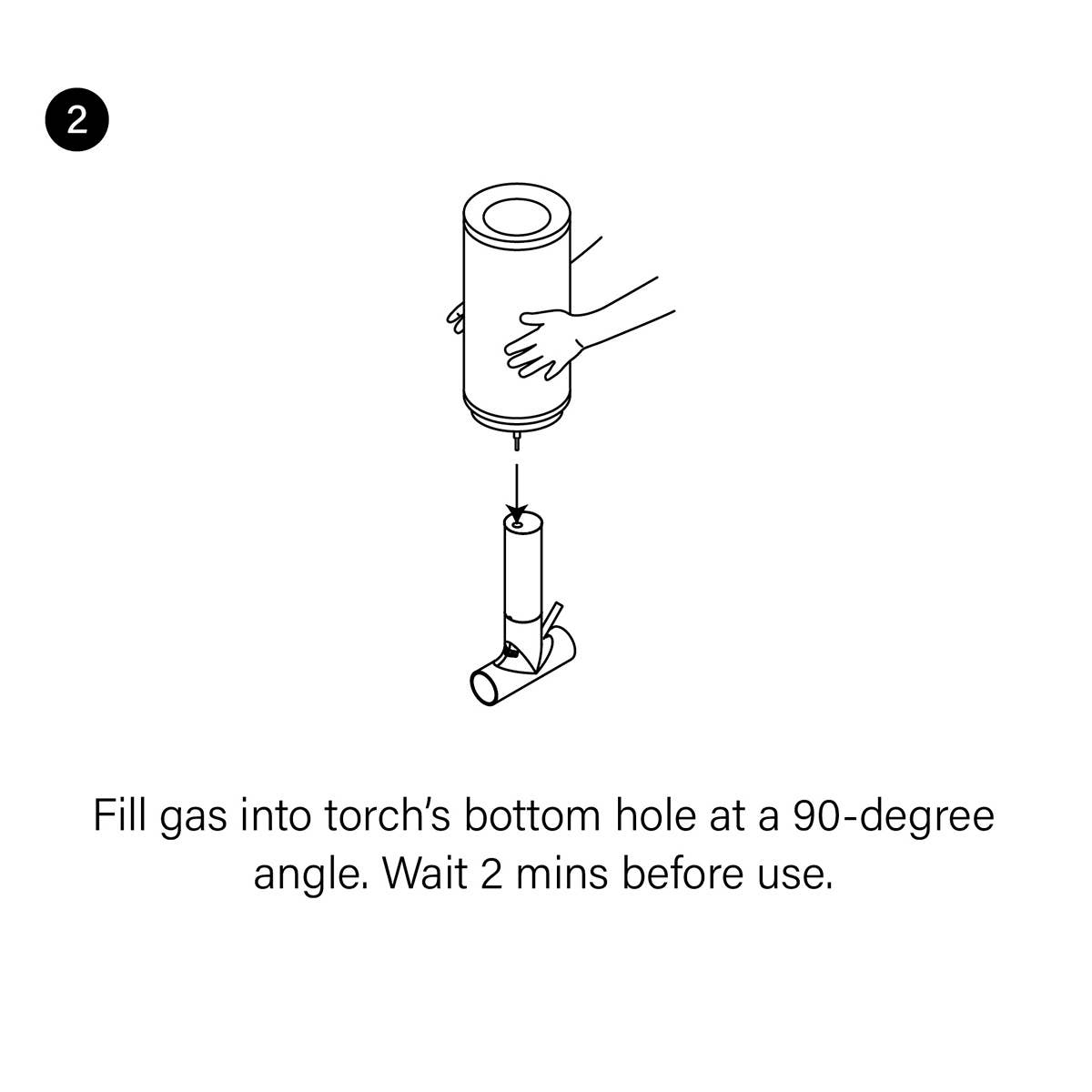 How to use 1. Remove the safety cap before use. Keep it on when not in use. 2. Fill gas into torch’s bottom hole at a 90-degree angle. Wait 2 mins before use. 3. Press the trigger to ignite. 4. Press the continuous button and release the trigger to keep the flame. Press the trigger again to stop. 5. Adjust the flame size with the switch. Starting small. Handle carefully. 6. Place it on the base after use for a stable stand.