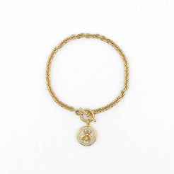 Vintage French bee encased in enamel forms this classic pendant on white enameled chain. 14k gold and featuring a toggle closure.