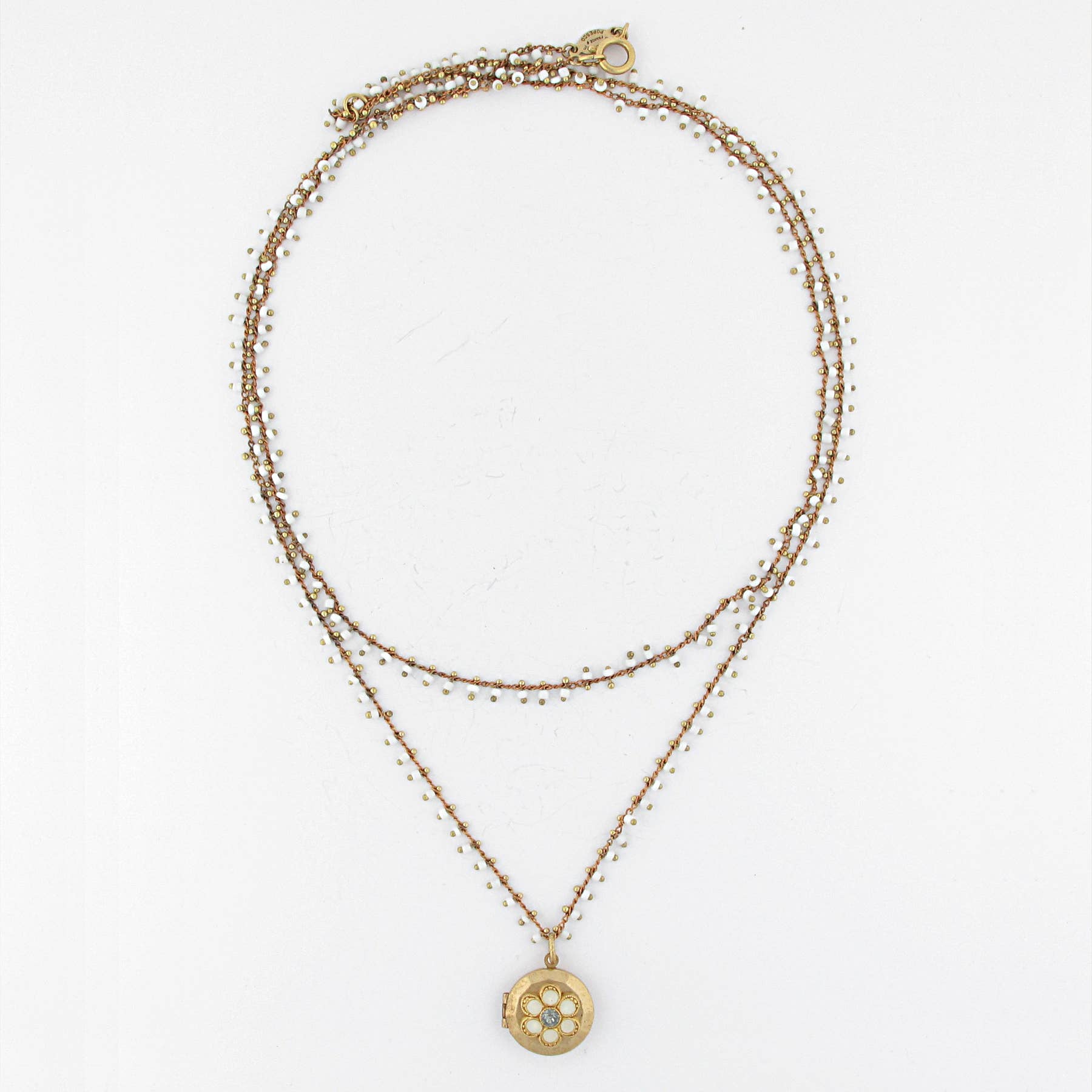 Classic locket detailed with a enamel flower on a white beaded lace like chain wear long or double up as shown